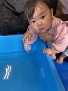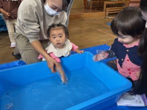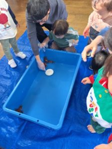 今日は、お遊戯室にみずみずランドのあそべ~る水族館が来てくれました🐟たくさんの水辺の生き物とふれあえてとても楽しかったですね♪